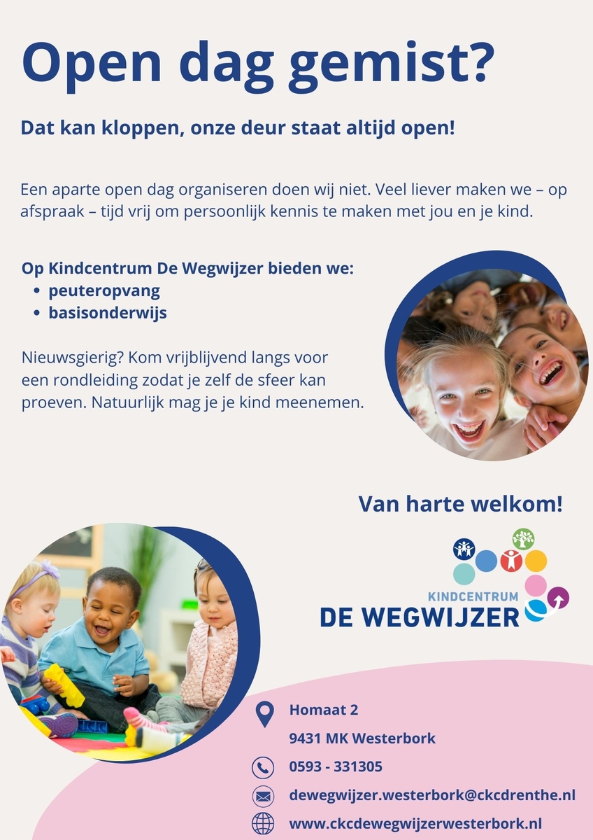 Op De Wegwijzer werken we met 5 groepen. We bieden onderwijs op maat in een omgeving die rust uitstraalt en structuur en regelmaat biedt. Binnen het onderwijs op De Wegwijzer staan spelen, ontwikkelen en leren centraal. We streven ernaar uw kind ervaringen, vaardigheden en kennis te geven waardoor zij hun talenten en kwaliteiten optimaal kunnen ontplooien.